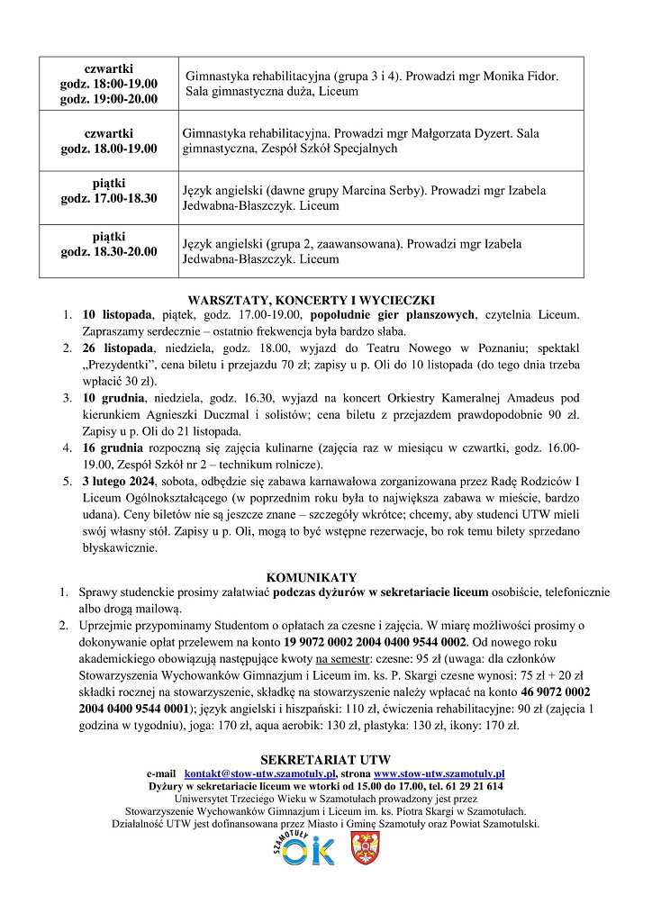 Sekretariat UTW czynny jest we wtorki w godz.15.00-17.00