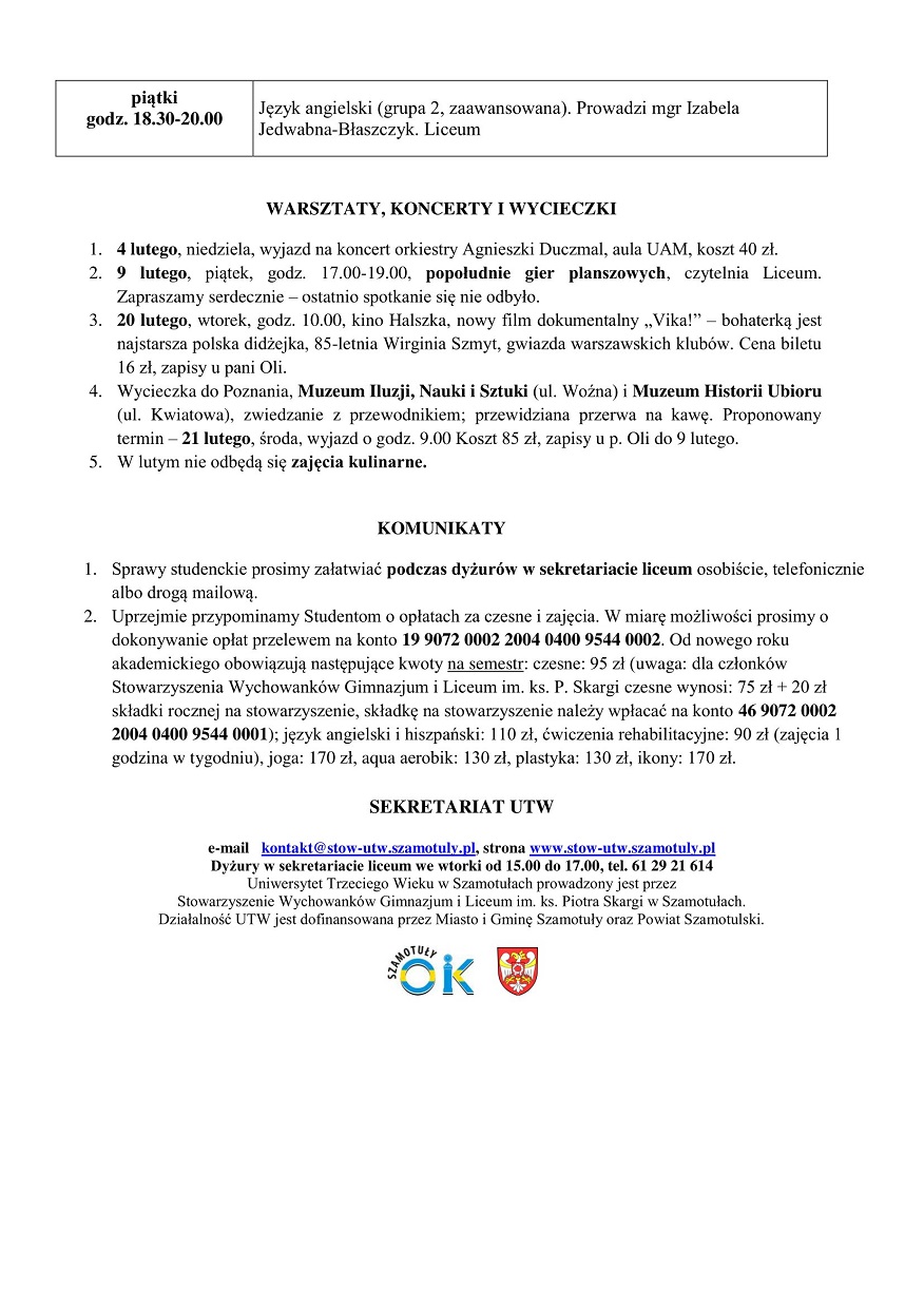Sekretariat UTW czynny jest we wtorki w godz.15.00-17.00